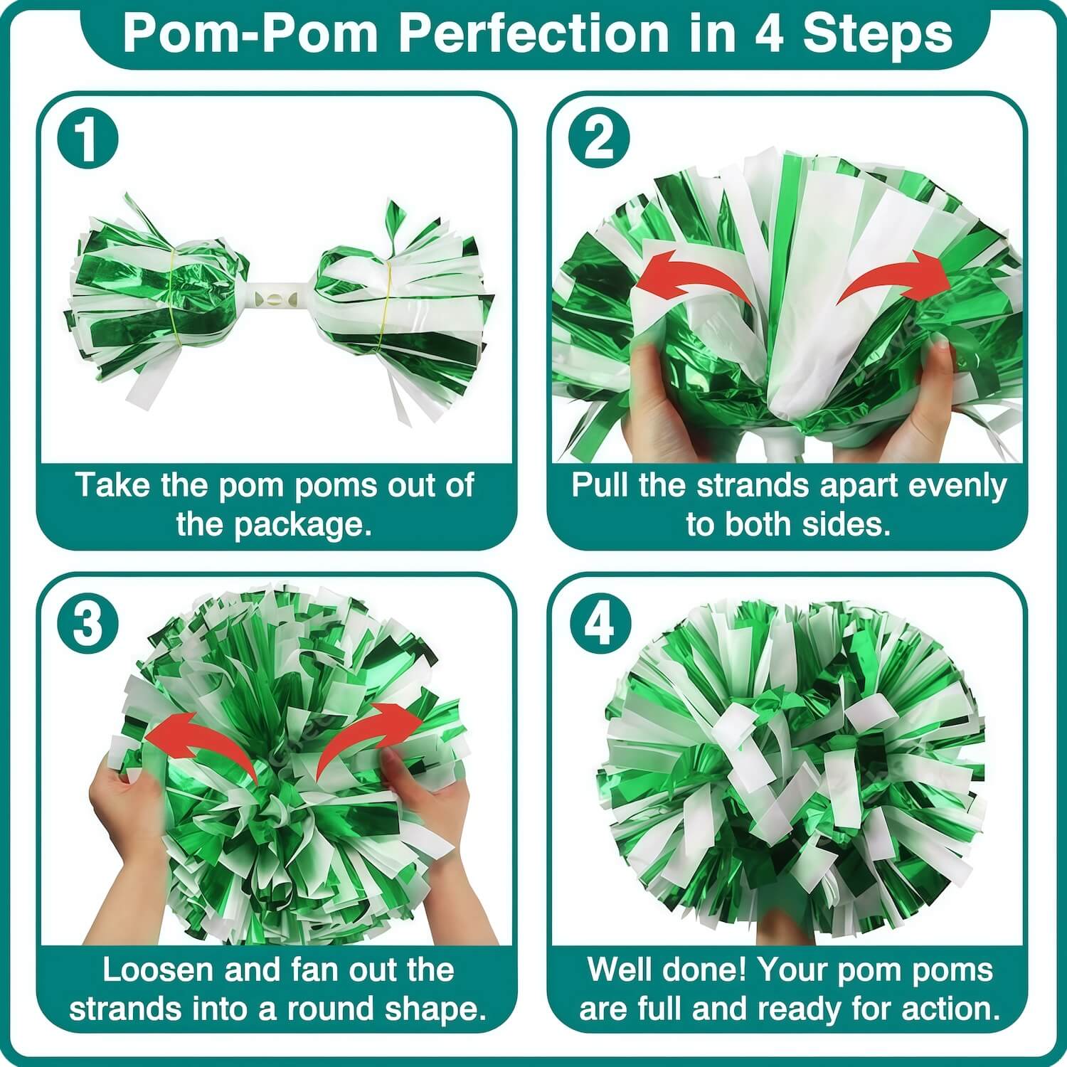 Shine Like a Champion: Engineered as championship cheerleading pom poms, the glossy strands shimmer under stadium lighting, helping your squad make a strong visual impact at tournaments and events.